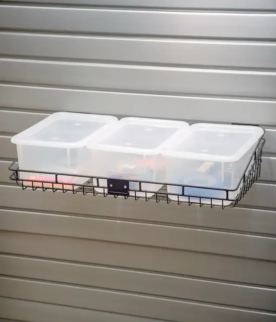 This 3 Bin Storage Basket Kit provides convenient, visible storage for small tools, hardware, and everyday essentials. The durable wire basket mounts securely to slatwall while the removable clear bins make it easy to sort and access items at a glance. Ideal for garages, workshops, utility rooms, or craft spaces, this kit keeps smaller items organized, contained, and off your work surface.