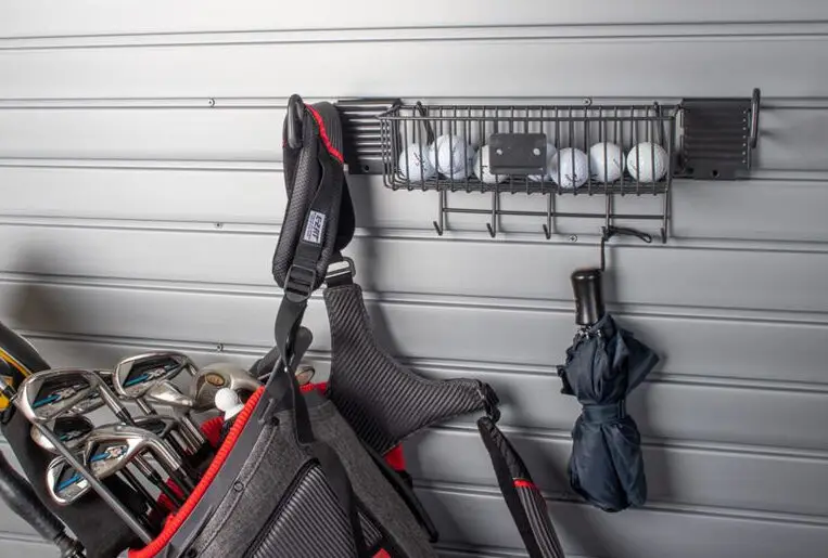 This golf accessory holder keeps your gear stored neatly, off the floor, and easy to access. It provides organized space for your golf balls, bag, and day of essentials like an umbrella and other accessories. A perfect storage solution for any golf enthusiast.