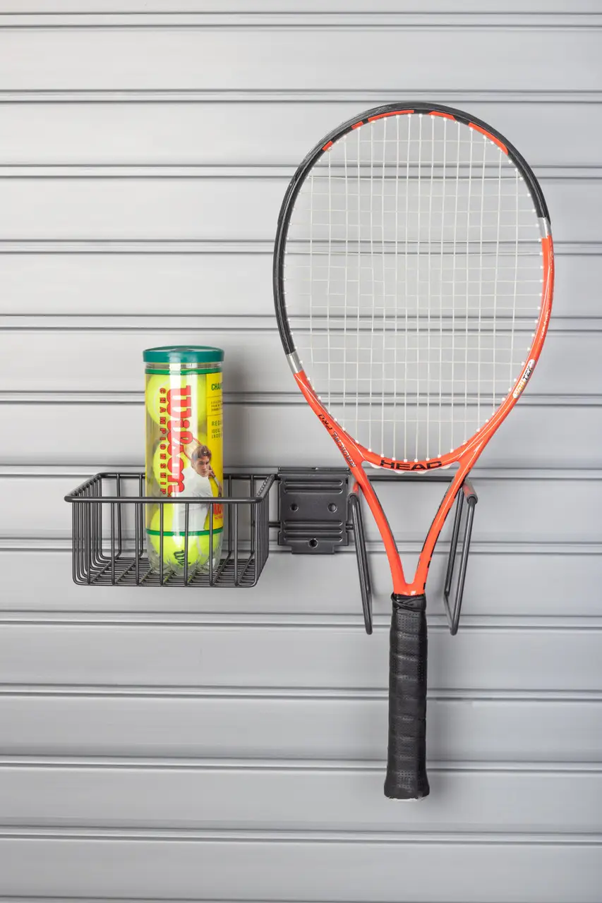 The tennis slatwall accessory holder keeps your rackets and balls stored neatly and within easy reach. Designed to mount securely on slatwall, it lifts gear off the floor to reduce clutter and protect your equipment. A simple, space saving solution for staying organized and ready to play.