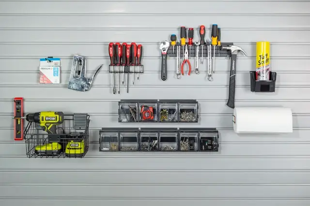Our Work Bench Accessory Kit includes 9 slatwall accessories specifically designed to help you organize your tools and work bench area. These heavy duty steel construction slatwall accessories are graphite colored with a soft-touch vinyl coating. The locking accessories ensure a secure connection to the slatwall when removing items from the accessories.